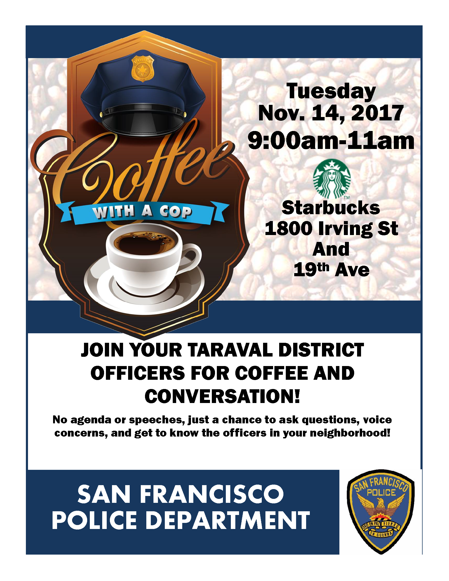 Coffee With A Cop 11/14/2017 By SFPD Taraval Station Newsletter | November 1, 2017 | Past Events | ← Daily Crime Report :: Sat – Oct 28, 2017 Daily Crime Report :: Sun – Oct 29, 2017 →