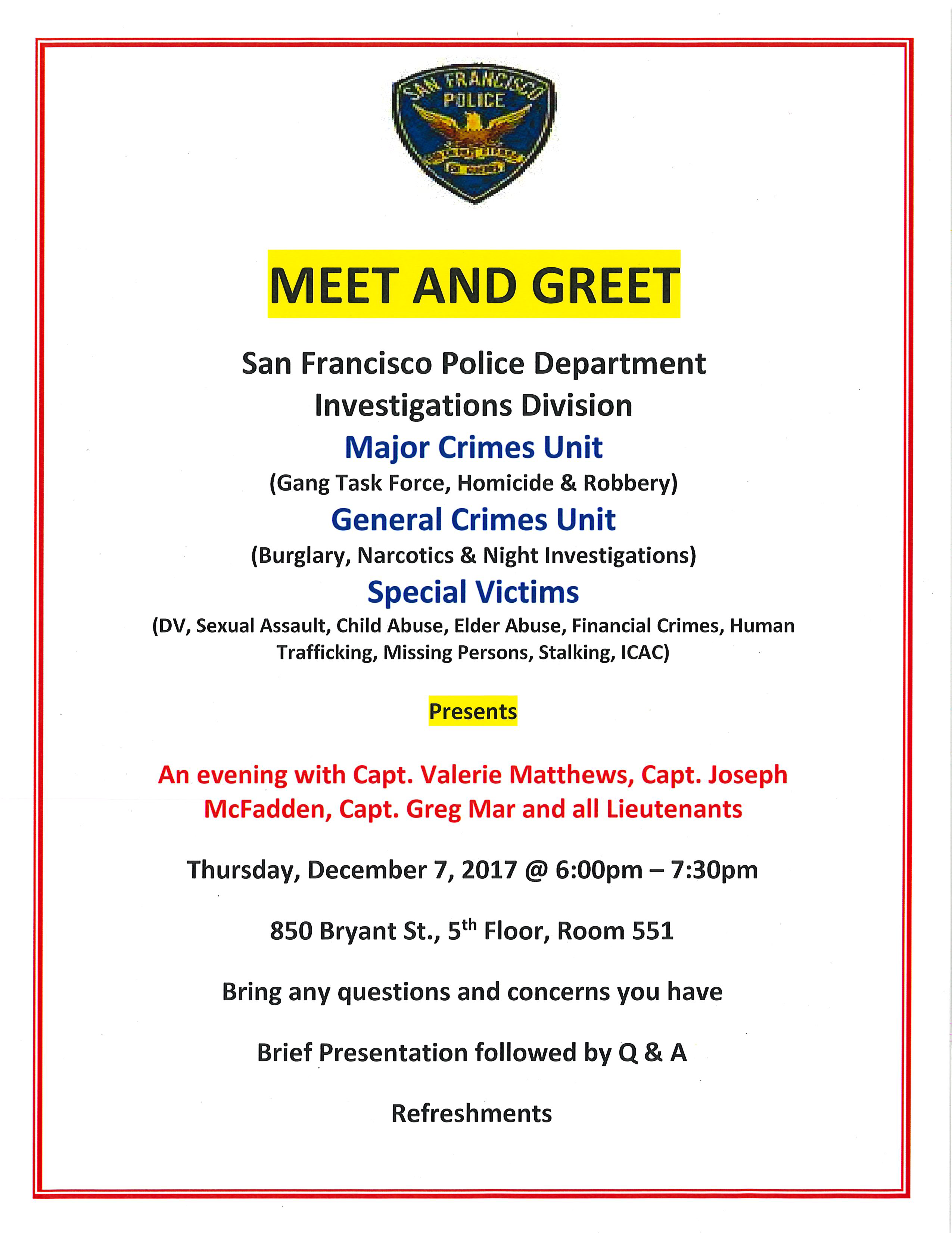 Investigations Bureau Meet & Greet By SFPD Taraval Station Newsletter | November 14, 2017 | Past Events | ← Daily Crime Report :: Fri – Nov 10, 2017 Newsletter – November 14, 2017 →