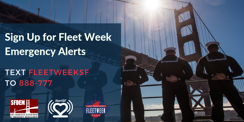 Sign up for San Francisco Fleet Week emergency text alerts from AlertSF. Simply text FLEETWEEKSF to 888-777 to sign up for emergency text message alerts. AlertSF will send alerts and instructions following a natural disaster, major police, fire, or health emergencies, or significant transportation disruptions to your mobile device. AlertSF is a service provided by the San Francisco Department of Emergency Management. Visit www.AlertSF.org to learn more.
