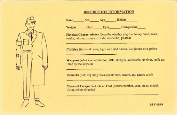 - Note the descriptions of any suspicious persons.